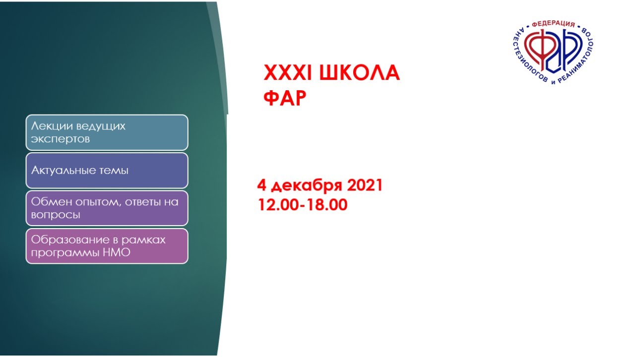 Видеозапись XXXI Онлайн-Школы ФАР, проведена 04.12.2021 00:03:12 Вячеслав Сергеевич Афончиков "Респираторная поддержка при торакальной травме" 01:08:05 Илья Наумович Лейдерман "Метаболический мониторинг у пациентов на длительной ИВЛ – когда, кому, зачем?" 01:50:10 Вадим Альбертович Мазурок "Тяжелая дыхательная недостаточность при COVID-19: когда шансов на успех больше" 02:52:40 Алексей Евгеньевич Карелов "Особые виды боли: проекционная, отраженная, иррадиирующая." 03:50:42 Рубен Сергеевич Ягубян "Электронная библиотека лекарственных препаратов в клинической практике: влияет ли она на качество медицинской помощи?"(Лекция при поддержке Fresenius Kabi)