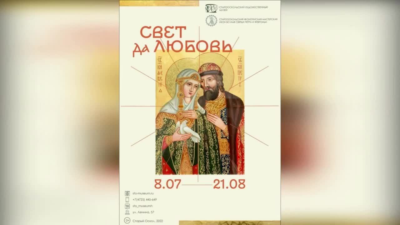 Выставка современной православной иконописи «Свет да любовь» представляет более 50 икон, созданных Старооскольской иконописной мастерской во имя Святых Петра и Февронии. Выставка приурочена памяти святых Петра и Февронии Муромских. Выставка состоит из нескольких тематических блоков: сюжеты главных православных праздников, Богородичные иконы, семейные иконы, образы особо почитаемых в России святых, а также на Белгородской и Оскольской землях. Презентацию выставки посетит курский священник, настоятель храма Покрова Пресвятой Богородицы в Кунье Владимир Русин, а также узкий круг единомышленников руководителя Старооскольской иконописной мастерской Станислава Саенко.
