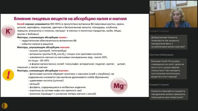 Пленарное заседание МГНОТ 14.10.2020: В докладе показана физиологическая роль калия и магния для организма человека, влияние на функцию сердечно-сосудистой системы. Освещены основные пищевые источники калия и магния, затронуты аспекты их усвояемости организмом, показано применение калия и магния в составе специализированных продуктов