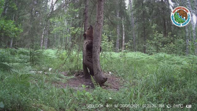 20.06.2025.Медведь.Заповедник Большая Кокшага.Зверь погнался за лосем, вернувшись почесался о дерево