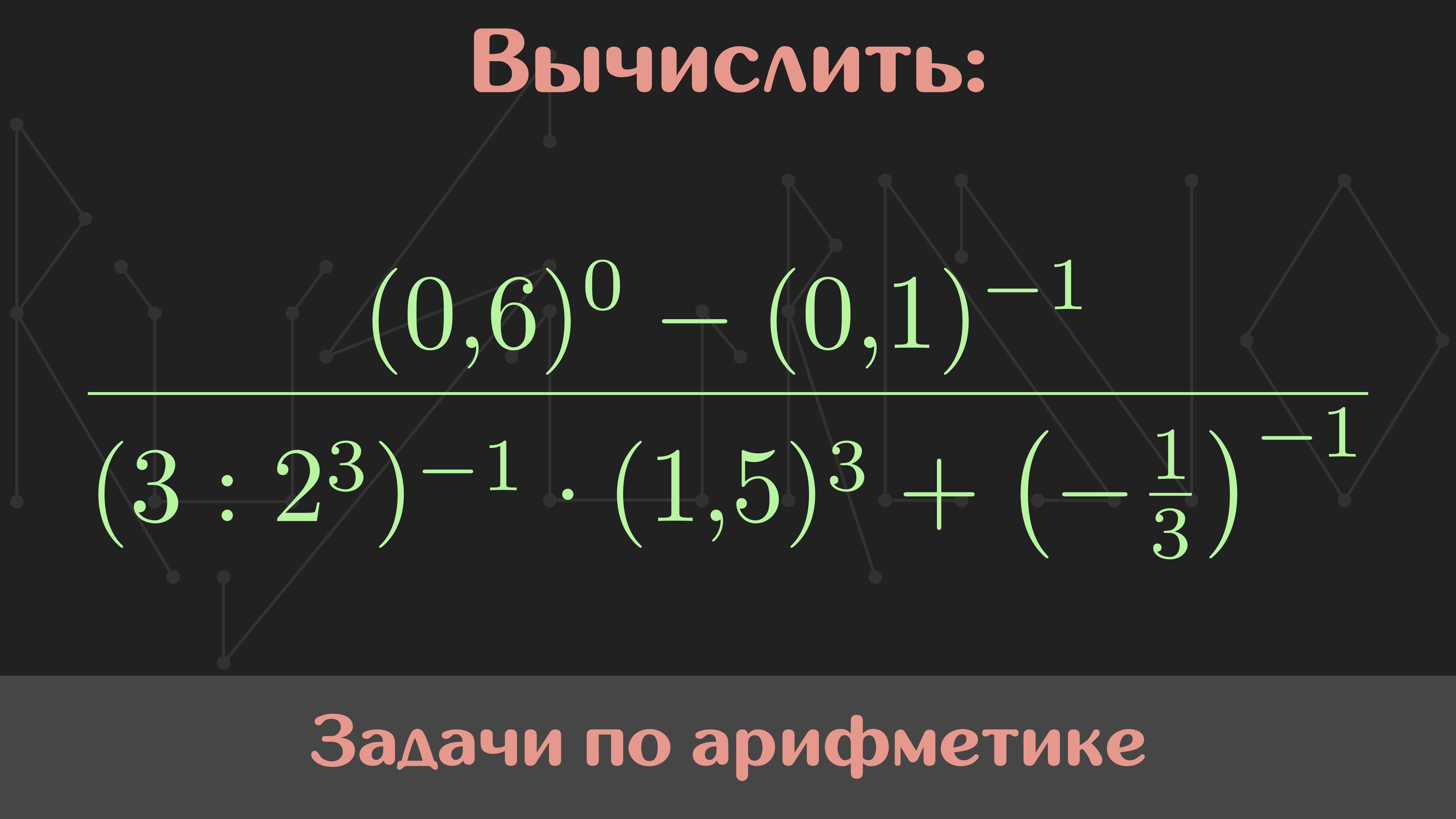 Мой курс по арифметике: https://stepik.org/a/195543 Условие: Вычислить ( (0.6)⁰ - (0.1)⁻¹ ) / ( (3 : 2³)⁻¹ * (1.5)³ + (-1/3)⁻¹ ) Памятка: перед просмотром решения задания обязательно попробуйте решить задачу самостоятельно. Так вы научитесь вырабатывать собственный подход к решению. Музыка: Nomyn — Moonlight #Сканави #Арифметика #РешайСоМной #Математика