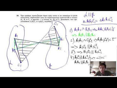 №64. Три прямые, проходящие через одну точку и не лежащие в одной плоскости, пересекают одну из параллельных плоскостей в точках A1, B1 и C1 а другую — в точках A2, B2 и C2. Докажите, что треугольники A1B1C1 и А2В2С2 подобны. Поддержать канал рублём - 5469400944002125 (Сбербанк) Мой второй канал для подготовки к ЕГЭ и ОГЭ - https://www.youtube.com/ЕвгенийСумин Инстаграм - https://www.instagram.com/EGE_OGE.math Личный инстаграм - https://www.instagram.com/ee_sumin VK - https://vk.com/evgeniysumin FB - https://www.facebook.com/EvgeniySumin