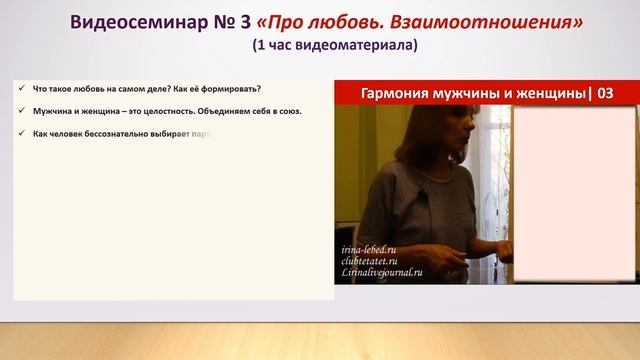 ➤ Ирина Лебедь - психолог, стратегический консультант. Опыт работы в области практической психологии – более 25 лет. ➤ Официальный сайт психолога Ирины Лебедь - http://www.irina-lebed.ru/ ➤ Видеосеминары Ирины Лебедь - http://www.irina-lebed.ru/obuchenie/ ✆ Как ещё можно с нами связаться: ✦Skype: irina.tetatet ✦Email: clubtetatet@bk.ru ✦WhatsApp: +7 (916) 812-21-73 ✦Telegram: https://t.me/masterskaya_probuzhdenie ✦Facebook: https://www.facebook.com/club.tetatet ✦ВК: https://vk.com/club38480683 ✦Twitter: https://twitter.com/Clubtetatet ✦ЖЖ: https://lirina.livejournal.com/ ✦YouTube канал: https://www.youtube.com/user/clubtetatet/featured ✒ По вопросам приобретения занятий и видеосеминаров Ирины Лебедь оставляйте заявки на почту: clubtetatet@bk.ru ➤ Проект ПРОБУЖДЕНИЕ рассчитан на год. За этот период: мы обретаем способность управлять собственной жизнью; - учимся распознавать, классифицировать людей по их природе, действиям, словам; - выстраиваем честные и понятные отношения; - ставим правильно цели и достигаем их в кратчайшие сроки; - уходим от программной судьбы, понимаем, что происходит вокруг и знаем, что со всем этим делать. ➤ За подробностями и условиями участия в проекте обращайтесь на почту clubtetatet@bk.ru. ✒ Запись на презентационную Skype-встречу о проекте также производится по почте clubtetatet@bk.ru или WhatsApp: +7 (916) 812-21-73 ➤ Презентация проекта "Пробуждение" и краткое содержание: https://youtu.be/Tu88Jxr_-dw ➤ Презентация обучения в мини-группе на проекте: https://youtu.be/F6GDigC9uUY ➤ Описание и содержание занятий: https://irina-lebed.ru/proekt-probuzhdenie/ ➤ ПЛЕЙЛИСТЫ по группам видео: 0. Презентации программ, семинаров и проектов: https://youtube.com/playlist?list=PLEISaR6AjsIg-Wo5iOnoPqq_KC17GF2VS 1. Секреты счастливых отношений:https://youtube.com/playlist?list=PLEISaR6AjsIhRJmAtlCPS_bEVzaYQN4L1 2. Муж и жена. Семья и отношения в ней: https://youtube.com/playlist?list=PLEISaR6AjsIifKYoxBt6hIDG2H0E83Dxu 3. Отношения с матерью: https://youtube.com/playlist?list=PLEISaR6AjsIivB5UcLfVyCFk594Z9cIC5 4. Отношения с отцом: https://youtube.com/playlist?list=PLEISaR6AjsIjktuBOZ9X8oTwQDQwQhpMJ 5. Страхи. Как перестать бояться?: https://youtube.com/playlist?list=PLEISaR6AjsIhRJmAtlCPS_bEVzaYQN4L1 6.Уверенность и самооценка: https://youtube.com/playlist?list=PLEISaR6AjsIiOLUwtqkDER6V6VJ1w5IRL 7. Мышления и убеждения. Как изменить: https://youtube.com/playlist?list=PLEISaR6AjsIjEjFD4qP__xLnvHdri77z2 8. Деньги и достаток: https://youtube.com/playlist?list=PLEISaR6AjsIheomC7eHNSiSGvzxEBiqrC 9. Как достичь желаемого: https://youtube.com/playlist?list=PLEISaR6AjsIinCh0w4NNspoPvNAok6mHx 10. Фрагменты проекта "Пробуждение": https://youtube.com/playlist?list=PLEISaR6AjsIgbe-vfZUVE8nHzwEyJGa8r 11. Презентации занятий проекта "Пробуждение": https://youtube.com/playlist?list=PLEISaR6AjsIipxPpRrCDmZwzX42MHESjB 12. Публичные консультации: https://youtube.com/playlist?list=PLEISaR6AjsIgktWzUVWeal5hcLS989dFe А также: "Как изменить привычки", "Прошлое, настоящее и будущее", "Как обрести силу", "Как достичь цели", "Психология стройности", "Женственность и женская природа", "Управление эмоциями, личные границы", "Как принять и поверить в себя", "Стримы", "Ответы на вопросы","Отношения со свекровью", "Семинары" и другие. Позвольте себе жить! #проектпробуждение #пробуждение #баланс #психологириналебедь #психолог