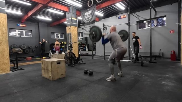 Комплекс На время, синхронно: 4 раунда 10 берпи фронтально через штангу 15 взятий с виса в стойку 40/30 кг 20 калорий гребля 13:07 (время)