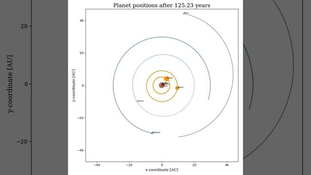 A numerical simulation of the solar system including all planets + Pluto using the Velocity Verlet algorithm for solving the many body problem. Simulation is over 250 years and with a time step of 1 day. Code is written in C++ and visualization is done with Python and Matplotlib.