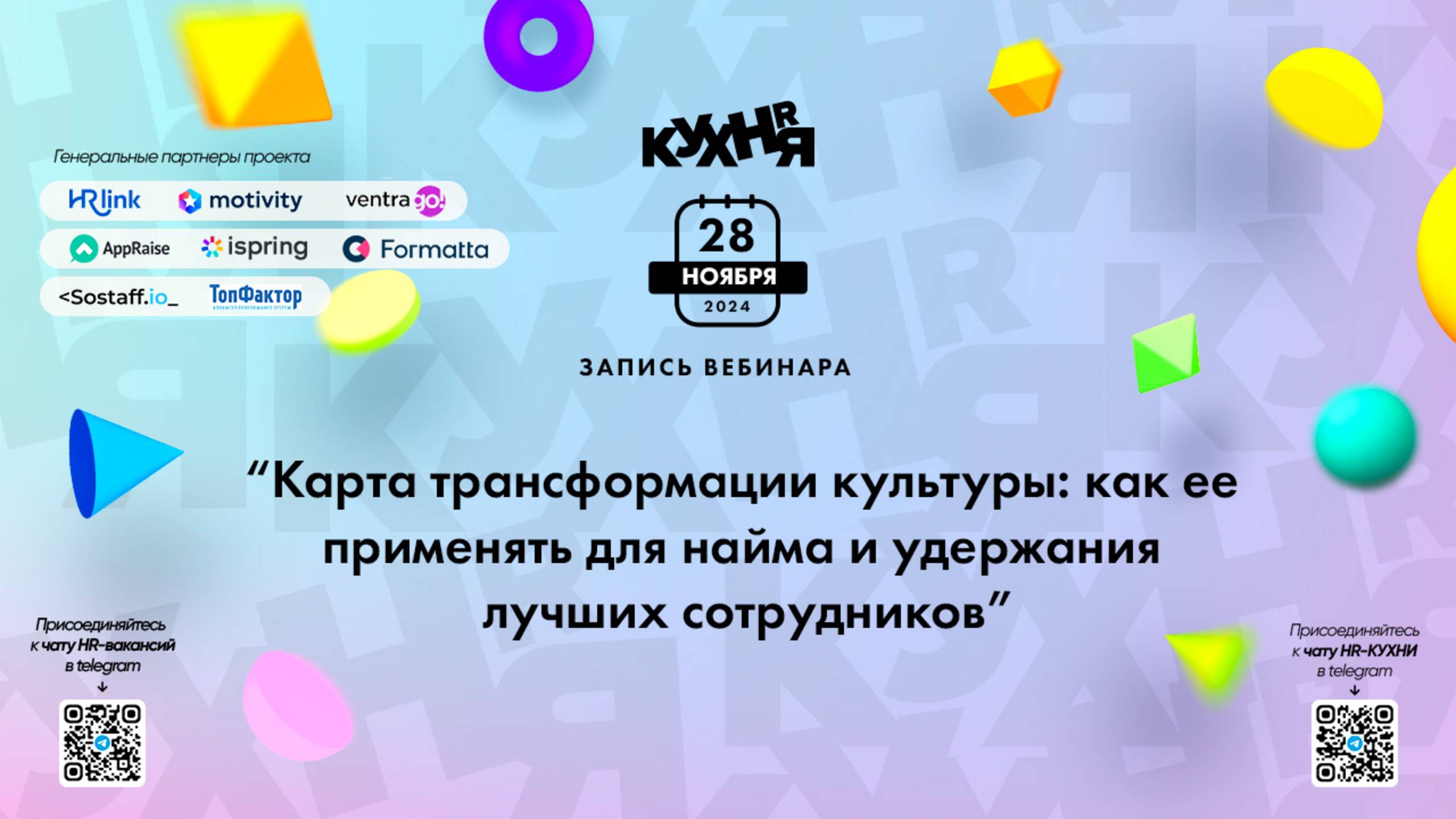 Присоединяйтесь к чатам и каналам HR-КУХНИ в телеграм: - Основной чат HR-КУХНИ в телеграм - https://t.me/+tYgAH0PgPQVkOWIy - Канал HR вакансий в телеграм - https://t.me/+CMNAN2u1hjo3M2Ri - Канал HR-EVENTS в телеграм - https://t.me/hr_kitchen - Канал HR JOURNAL в телеграм - https://t.me/hrkitchenjournal Полезные ссылки: - Каталог HR решений - https://hrkitchen.ru/exhibition - График конференций, бесплатных вебинаров, а также бесплатные курсы – https://hrkitchen.ru/ - Стать спикером HR-КУХНИ - https://hrkitchen.ru/speakers - Подписаться на полезную e-mail рассылку от HR-КУХНИ (новости, гайды, чек-листы, подарки от партнеров) - https://hrkitchen.ru/subscribe