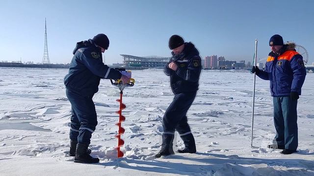 Сотрудники МЧС России и городские спасатели проверяют толщину льда на реке Амур