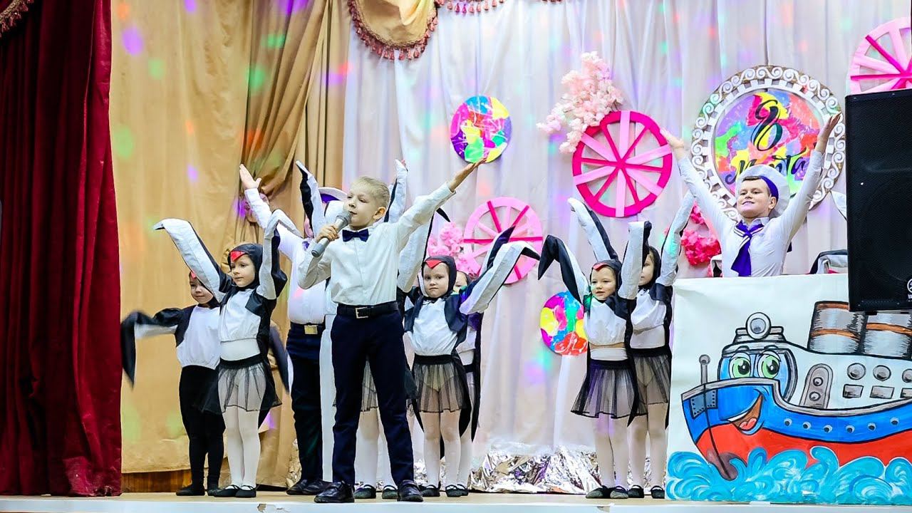 Роман Дубяга (7 лет) и хореографический ансамбль ГДК Факел Преподаватель по вокалу Куприянов М.И. В Антарктиде льдины землю скрыли, Льдины в Антарктиде замела пурга, Здесь одни пингвины прежде жили, Ревниво охраняя свои снега. Ревниво охраняя свои снега. Как-то раз пингвины в полном сборе К морю на рыбалку побрели гурьбой, Странную картину видят в море: Огромный чёрный айсберг дымит трубой! Огромный чёрный айсберг дымит трубой! Струсили пингвины - что же будет? И откуда ветер к ним пригнал гостей? Видят, как на льдину сходят люди, Впервые повстречали они людей. Впервые повстречали они людей. Люди их спугнули песней звонкой, Тишины нарушив многолетний плен, Небо затянули сетью тонкой, Развесив паутину своих антенн. Развесив паутину своих антенн. И с людьми пингвины ходят рядом, Слушают усердно каждый день эфир. И теперь пингвины людям рады, Ведь люди для пингвинов открыли мир! Ведь люди для пингвинов открыли мир! Ведь люди для пингвинов открыли мир
