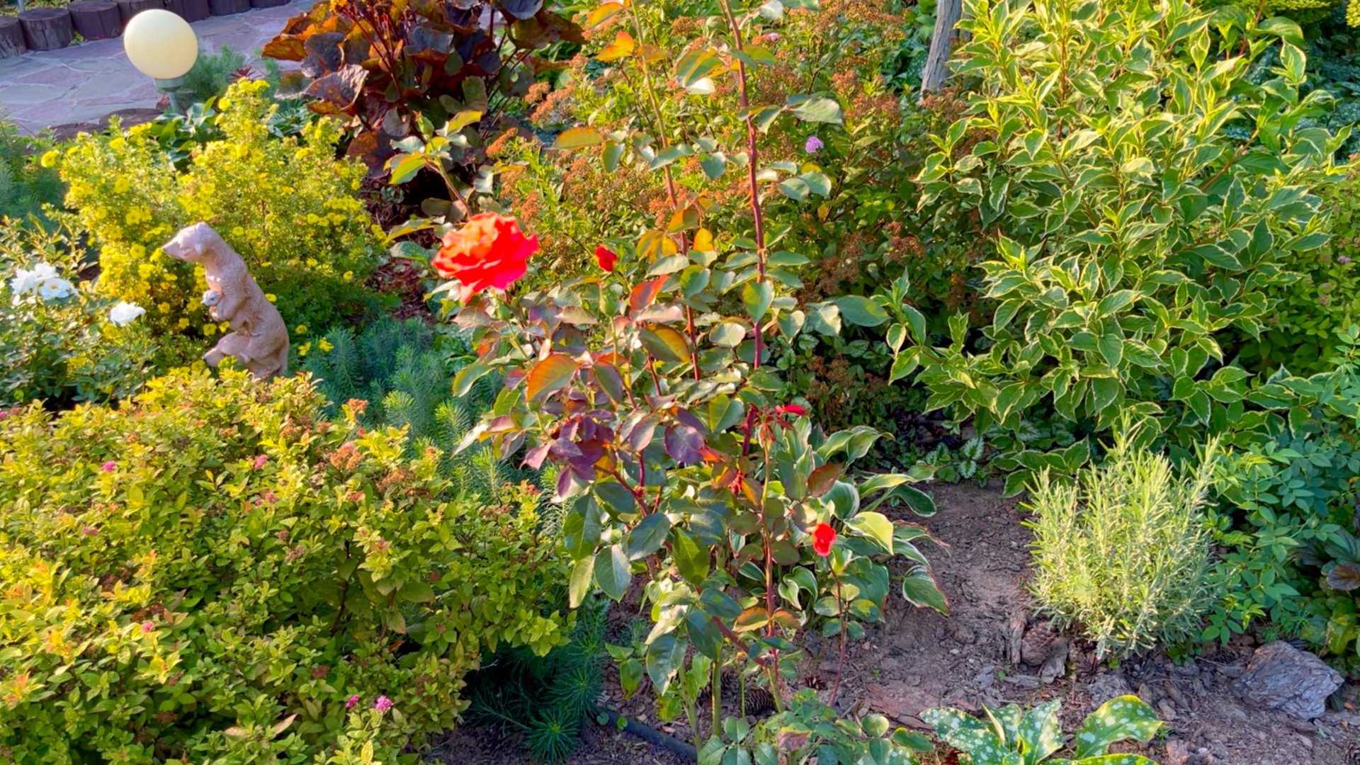 Обзор смешанной многолетней клумбы перед домом.