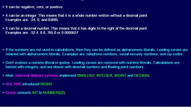 Explains exact numeric data types with a comparison of usage by the major databases. From http://ComputerBasedTrainingInc.com SQL Course. Learn by doing SQL commands for ANSI Standard SQL, Access, DB2, MySQL, Oracle, PostgreSQL, and SQL Server.