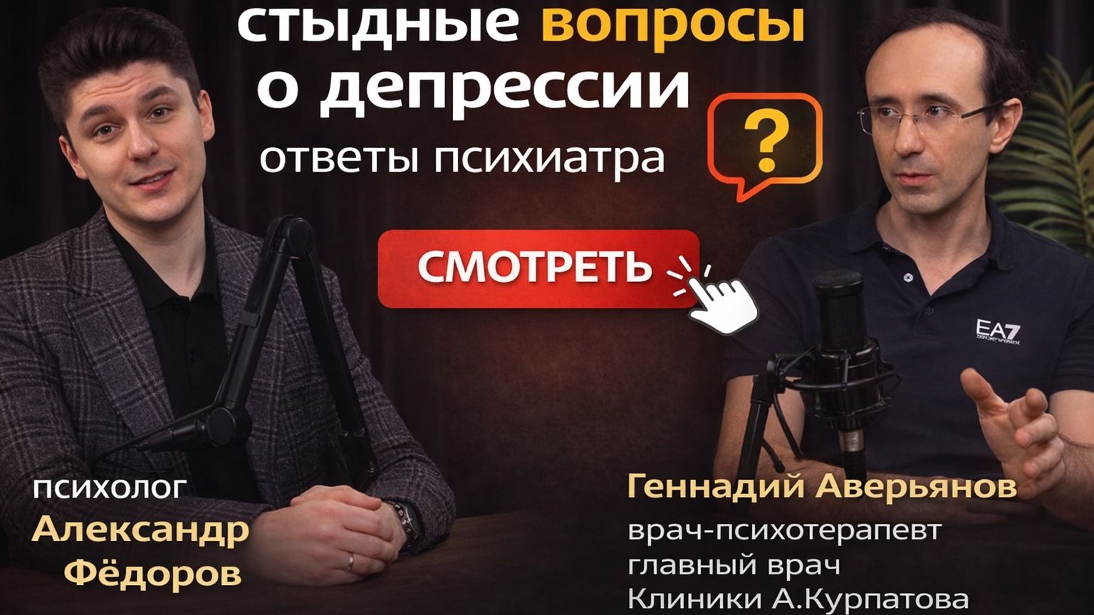 В этом выпуске психолог Александр Федоров и врач-психотерапевт Геннадий Аверьянов откровенно говорят о симптомах, лечении, страхах пациентов и распространённых мифах о депрессии. Это разговор для тех, кто хочет лучше понять себя, своих близких и разобраться в теме психического здоровья без стыда и предрассудков. 📌В видео: - как распознать депрессию - когда стоит обратиться к специалисту - почему психологи не распознают депрессию и не могут помочь при депрессии? - правда и мифы об антидепрессантах - почему людям стыдно говорить о своём состоянии - можно ли справиться с депрессией самостоятельно Подписывайтесь на нашу группу в ВК, чтобы не пропускать новую информацию о психическом здоровье. Геннадий Аверьянов: Телеграм-канал *соц.сеть запрещенная в РФ*: @doc_averianov Александр Федоров: Телеграм-канал *соц.сеть запрещенная в РФ*: @memes_psychotherapy