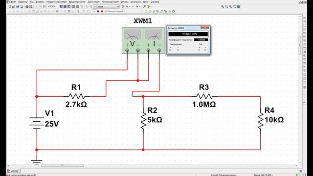 Для измерения в исследуемой нами схеме можно использовать ваттметр. Будем работать с вот этой схемой. Дважды щелкнем по иконке ваттметр на панели инструментов. Ваттметр будет привязан к курсору мыши. Что бы отобразить мощность, рассеиваемую резистором R1, поместим ваттметр в нужное для нас место. Что бы измерить мощность, нужно измерить напряжение и ток идущий через резистор. Измерение тока с помощью ваттметра выполняется так же, как и помощью мультиметра или индикатора тока, если входит в плюс и выходит из минуса, на экране отобразится положительное значение. Подключим устройство.