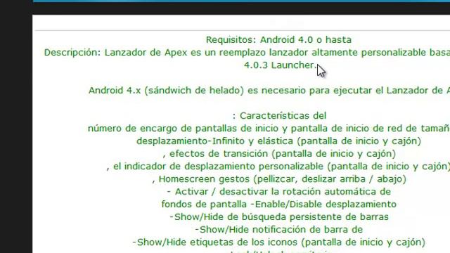 Requisitos: Android 4.0 o hasta Descripción: Lanzador de Apex es un reemplazo lanzador altamente personalizable basado en el AOSP 4.0.3 Launcher. Android 4.x (sándwich de helado) es necesario para ejecutar el Lanzador de Apex. Mira y enetrate mas aquí http://madows-zona-android.foroactivo.com/t101-apex-launcher