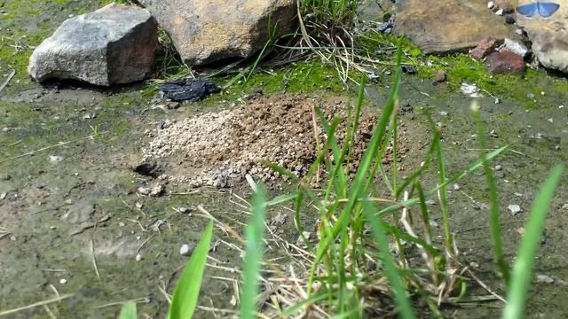 At work, a Great Golden Digger Wasp - Sphex ichneumoneus http://www.insectidentification.org/insect-description.asp?identification=Great-Golden-Digger-Wasp Visited by what is probably an Eastern Tailed Blue butterfly - Everes comyntas. Taken handheld, prone using a "Samsung Full HD" inexpensive pocket camera.