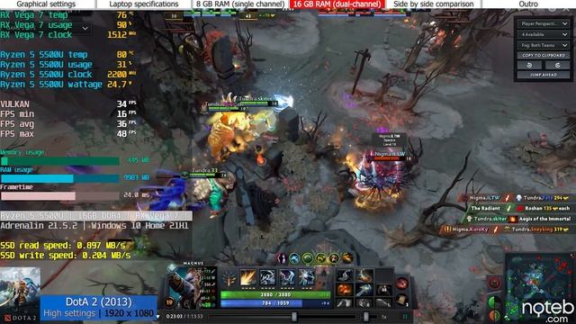 Acer Aspire 5 A515-45, DOTA 2 benchmark. Running on the Ryzen 5 5500U with RX VEGA 7 graphics. Gameplay is recorded at 1080p with an Elgato 4K60S+. Timestamps: 0:00 Settings 0:11 Specifications 0:15 Gameplay 8GB (single channel) [ FHD , High settings ] 4:43 Gameplay 16GB (Dual channel) [ FHD , High settings ] 9:20 Side-by-side comparison [ FHD , High settings ] 10:18 Outro Specifications: ● Display: 15.6" , 1920 x 1080, 60Hz ● CPU: AMD Ryzen 5 5500U ● GPU: Radeon RX VEGA 7 ● RAM: 16GB DDR4 MHz (dual channel) ● SSD: 256GB M.2 PCIe SSD ● HDD: 1TB SATA 5400 RPM ● Wi-Fi: Intel AX201 ● OS: Windows 10 Pro You can see the full specifications here: ● https://noteb.com/?model/model.php?conf=_5453&ex=USD If you enjoy our content, you can always show your support on Patreon: ● https://www.patreon.com/noteb For more news, you can also check our Twitter and Facebook accounts or you can join our discord server: ● https://discord.com/invite/aXqPsz4 ● https://twitter.com/notebcom ● https://www.facebook.com/notebcom/
