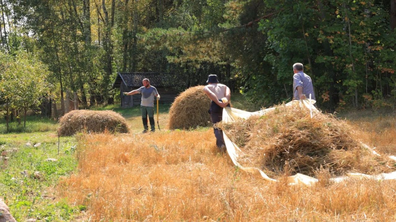 Простая деревенская жизнь. Традиционное сенокошение в деревне. Новые деревянные стены.