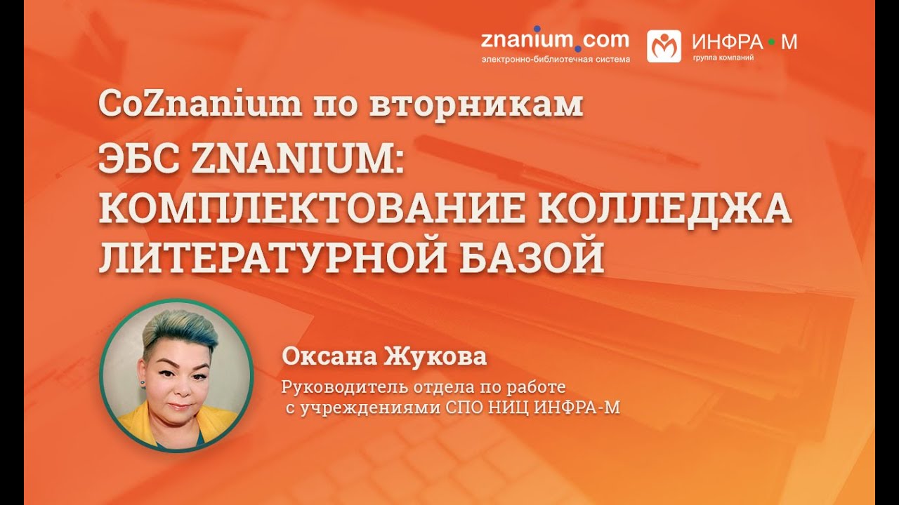 Руководитель отдела по работе с учреждениями СПО НИЦ ИНФРА-М Жукова Оксана рассказывает, чем полезна электронно-библиотечная система Znanium для колледжей. В этом видео: - С чего начать работу в ЭБС Znanium? - Литература в бумажном и электронном виде: как правильно выбрать и оформить заказ? - Как найти литературу именно для Вашего учебного заведения? - Как ЭБС Znanium помогает при аккредитации? - НОВИНКА! Виртуальные интерактивные практикумы: что это такое, как ими пользоваться? - Что мы сделаем для Вашего колледжа абсолютно бесплатно? - Ответы на самые частые вопросы Ваших коллег.