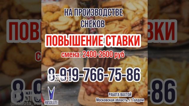 ❗️НАПОМИНАЕМ! ??Что на производстве по изготовлению снеков к пиву ПОВЫШЕНИЕ СТАВКИ! ✔️ Оплата за смену – 2400-2600 руб. (на руки, без каких-либо удержаний!) ✔️ Смены дневные 08.00-20.00. Выходной по согласованию с бригадиром ✔️ Бесплатное проживание в квартире 3-х комнатной! Постельное белье берите свое, также как и средства личной гигиены + ложки, кружки, кастрюльку ✔️ Питание самостоятельно. На производстве есть комната приема пищи. ✔️ На производстве в некоторых цехах влажность. ✔️ Спецодежда выдаётся Бесплатно ✔️ Еженедельные авансы по четвергам 2000 рублей. О наличии свободных мест уточняйте в ОТДЕЛЕ КАДРОВ ?????? ☎️ 89197667586 (WhatsApp, Viber) http://wa.me/79197667586 ☎️ 89771289232 (WhatsApp, Viber) http://wa.me/79771289232 Наш Телеграмм канал с видео о работе и отзывами сотрудников: Работа.Вахта.Абсолют Подписывайтесь, и будьте в курсе всех новостей с наших производств. ?? https://t.me/vahta_ok Страничка ВК: https://vk.com/rabota_vahta_absolut Страничка в ОК: https://ok.ru/profile/579701607021?utm_campaign=ios_share&utm_content= #москва #тула #работа #вахта #работавмоскве #семейныепары #вакансии #прямойработодатель #череповец #вологда #ярославль #владимир #рязань #псков #job #staff #брянск #волгоград #екатеринбург #чебоксары #воронеж #тамбов #моршанск #мичуринск #урюпинск #самара #балашов #салават #элиста #уфа