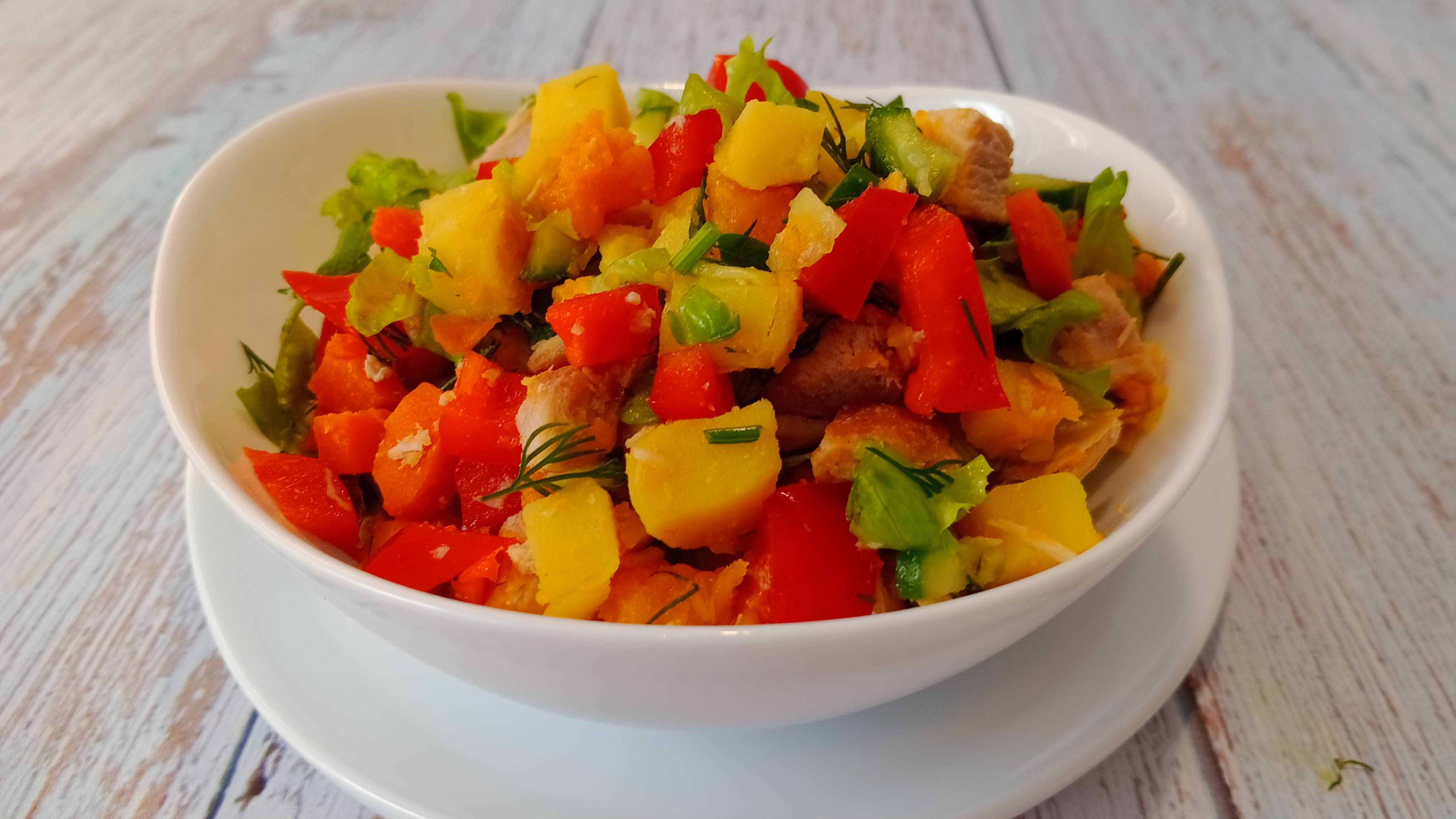 Осенний салат с мясом и овощами и зеленью. Мясо для салата используем запечённое в духовке. Овощи тоже запеченные в духовке. Это морковка, картошка, тыква. Красный болгарский перец, помидорки. Свежий огурчик, укроп,петрушка и листья салата. Порядок приготовления: Режем мясо на квадратные кусочки. Складываем в стеклянную миску. Картофель очищаем от кожуры и нарезаем кубиками. Отправляем к мясу.Болгарский перец- режем на квадратики и в миску. Так же поступаем с морковкой и огурцом. Следом режем яркую и ароматную тыкву. Нарезаем зелень-укроп,петрушку и листовой салат. Добавляем всё в большой салатник. Чуть чуть солим и перемешиваем все ингредиенты. Выкладываем в красивую белоснежную чашу и подаём к столу. Осенний вкусный салат с духовым мясом,овощами и зеленью готов. Приятного аппетита и богатырского здоровья! Приятного аппетита! Приготовьте по данному рецепту , попробуйте. Пишите свои впечатления в комментариях. Буду рад. Телеграм канал Органический фермер https://t.me/+Vw1PAJimUD45ZjRi Телеграм канал "Очень вкусно" https://t.me/ochen_vcusno там собираю рецепты со всего мира. Рецепты на каждый день https://t.me/recipe_days Дзен- https://dzen.ru/foodlegger https://dzen.ru/shortsfood Nuum https://nuum.ru/channel/organic-farmer ВК-https://vk.com/food_legger https://ok.ru/group/70000008179915 Ютуб-https://www.youtube.com/channel/UCDQ2hV1Fg5nNZhAj3cKDgMg Телеграм-https://t.me/ochen_vcusno ВК-https://vk.com/food_legger Переходи по ссылке,подписывайся, будем дружить. Поддержать меня как автора и отправить благодарность можно по ссылке https://www.donationalerts.com/r/safinartur #сезонконтентаRUTUBE #еда #рецепт #салат #мясо #завтрак