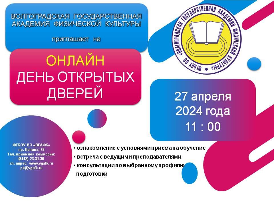 27 апреля 2024 года в 11:00 Волгоградская академия физической культуры приглашает посетить день открытых дверей в формате онлайн!