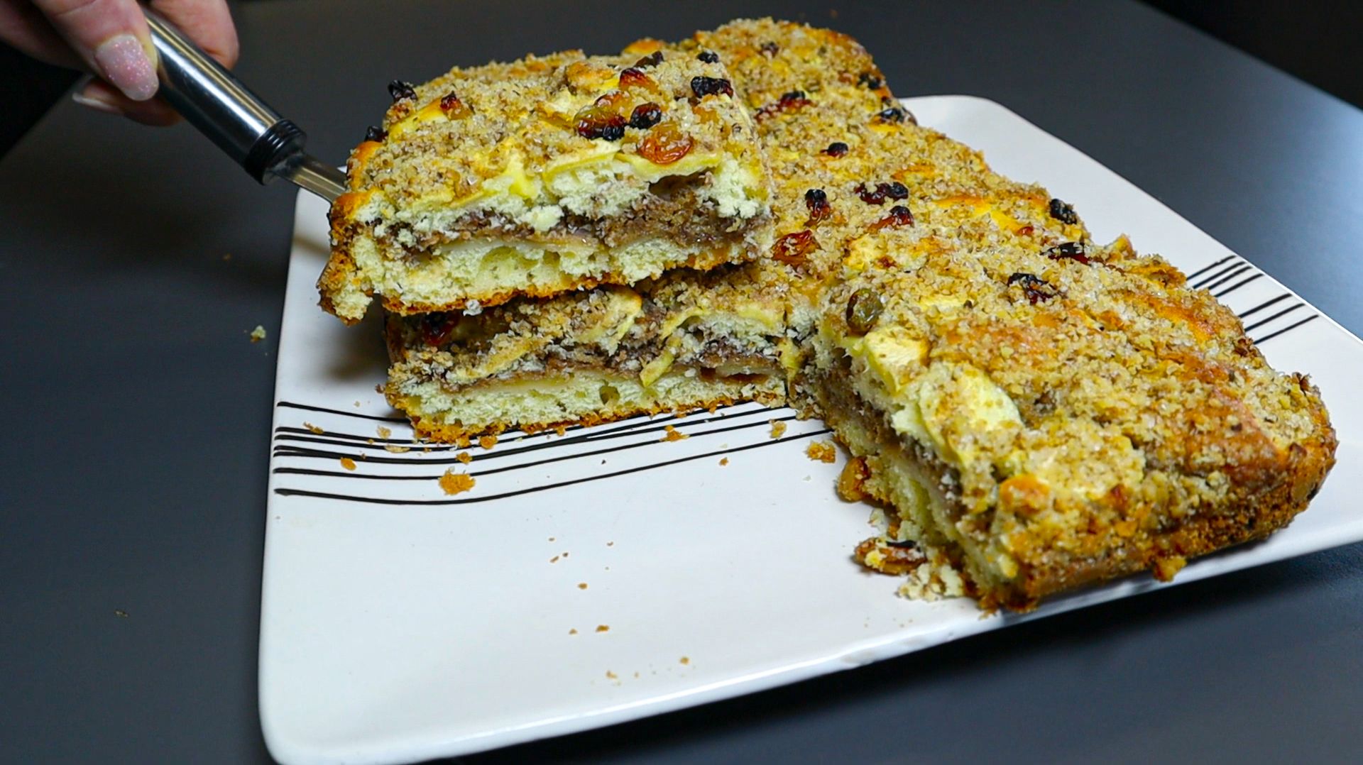 Возьмите 2 яблока и приготовьте этот восхитительный десерт! Очень просто и вкусно! Добрый день! Сегодня приготовим обалденно вкусный яблочный пирог. Рецепт десерта к чаю. - 2 яйца + щепотка соли. - сахар 80 г. - ванильный сахар 10 г. - молоко 80 мл. - сливочное масло 80 г. - мука 200 г. + разрыхлитель 15 г. - смазываем сливочным маслом и добавляем немного муки. - выкладываем половину теста. - 2 яблока. - грецкий орех 100 г. - изюм. - в духовку на 35 минут при 180°С. Наш яблочный пирог готов! Если понравилось поставьте лайк, подпишитесь и напишите комментарий!
