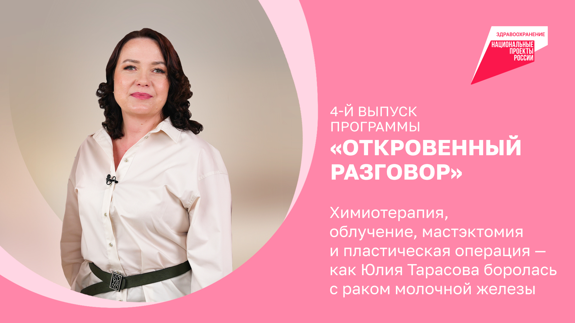 «Не надо ничего откладывать», — считает Юлия Тарасова. Героиня программы «Откровенный разговор» узнала о своём диагнозе за четыре дня до 42-го дня рождения. С тех пор она прошла трудное лечение и сейчас находится в ремиссии. Выстоять Юлии помогли физическая активность и поддержка участниц организации «Всё в твоих руках». Как героине удавалось совмещать спорт и работу с лечением? Как складывается её жизнь дальше? Смотрите в новом выпуске программы. Рак молочной железы — одно из самых распространённых онкологических заболеваний у женщин. Благодаря нацпроекту «Здравоохранение» в стране открываются онкоцентры с инновационным оборудованием, а следить за здоровьем и получать качественную медицинскую помощь становится проще. #нацпроекты #нацпроектздравоохранение #здоровьевприоритете