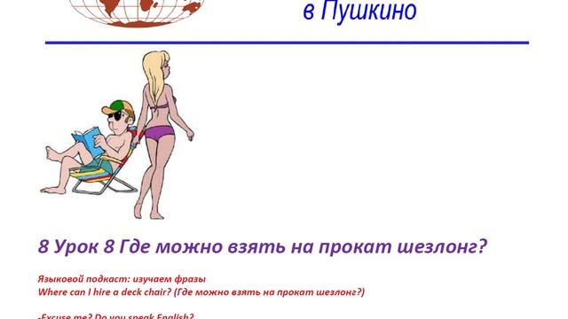 Школа Английского Языка в Пушкино _ Качественное образование в России _ Английский для начинающих 8 Урок 8 Где можно взять на прокат шезлонг? В машине, на электричке, в парке, на отдыхе, на велосипеде, в кровати – слушайте, слушайте, слушайте!!! Слушайте лучшие мировые курсы с Русской Адаптацией! Делайте это регулярно! 10 минут каждый день – и уже приобретены минимальные навыки восприятия речи на слух! А. Майоров 19 ноября, 2024 СПАСИБО, что ВЫ с НАМИ! e-mail: english-school@yandex.ru тел.: 8-926-496-74-99 / 8(49653)2-51-05