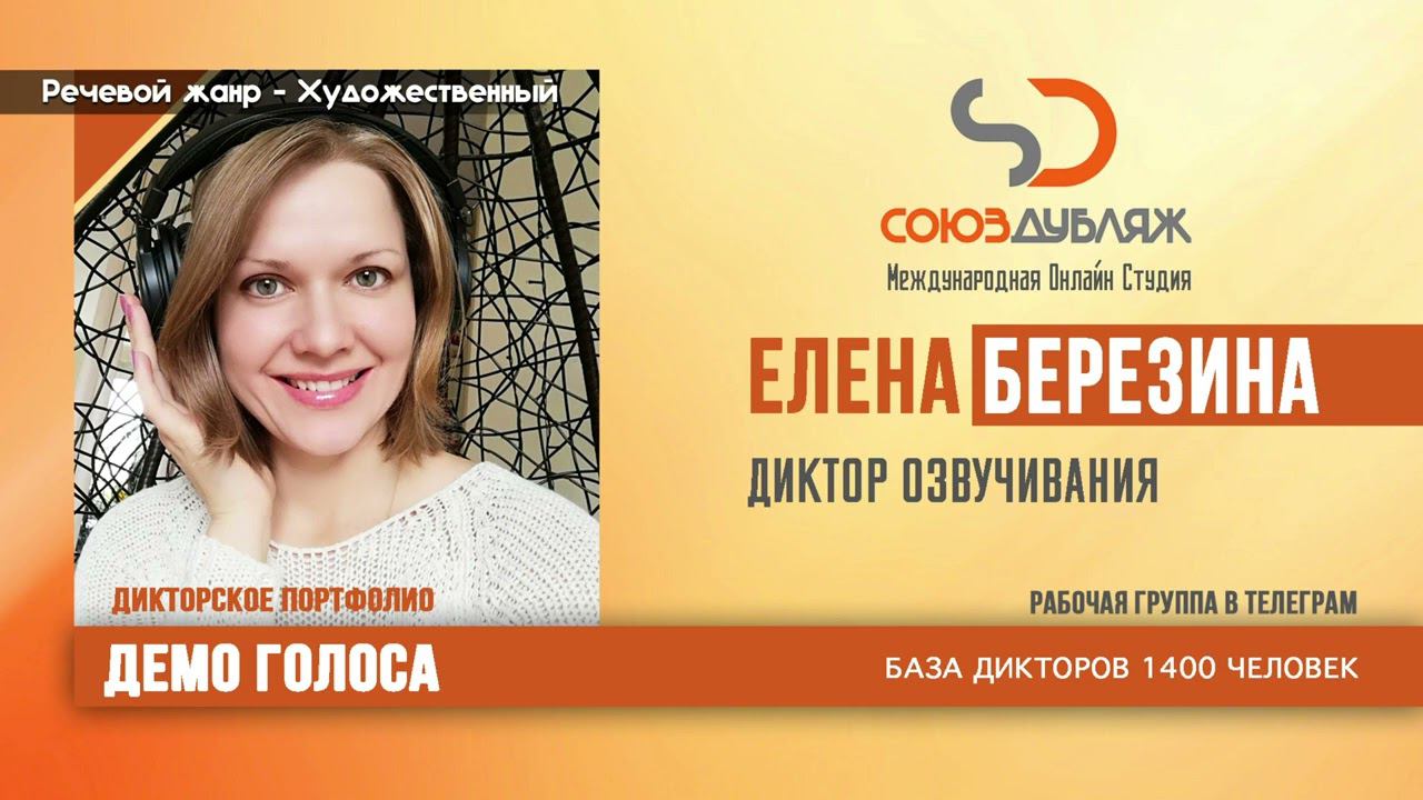 #СоюзДубляж #БазаДикторов #Озвучка ✔️Елена Березина, диктор озвучивания. Международная Онлайн-Студия "СОЮЗДУБЛЯЖ" - профессиональная озвучка и дубляж. ▪️Рабочая группа в Телеграм: https://t.me/soyuzdubliazh ▪️Контакт для связи: https://t.me/SoyuzAdmin ▪️Подпишись:https://www.youtube.com/c/SOYUZDUBLIAZH ▪️Сайт: https://www.soyuzdubliazh.com/ Лучшие голоса для вашей аудиорекламы и видеороликов. База дикторов - 5 000 человек, профессионального уровня на ENG| FR| TR| RU| ISR| AZ| UA| KZ| UZ| языках. Мужские и Женские топовые голоса для озвучки любых проектов, таких как: Рекламы, Презентации, Фильмы, Сериалы, Игры, Мультфильмы, ТВ Шоу, Аудио-видео визитки. ✔️Сотрудничая с нами вы получаете свой проект под ключ, не выходя из дома или офиса. Наша слаженная команда из лучших дикторов, актёров озвучивания, режиссёров и звукорежиссёров в кратчайшие сроки озвучат или отдублируют ваш заказ на профессиональном уровне. Образцы работ нашего портфолио вы сможете посмотреть на канале СОЮЗДУБЛЯЖ. ВНИМАНИЕ: ✔️Мы приглашаем специалистов озвучки к сотрудничеству в нашей команде. Вы можете пройти по ссылке в наш телеграм канал и связаться с Админом для обсуждения. ✔️Всем заказчикам подобных медиа проектов по озвучки и дубляжу фильмов, сериалов, документалок обращаться непосредственно к Админу Телеграм группы СОЮЗДУБЛЯЖ, пройдя по ссылке: Проходи по ссылке: https://t.me/soyuzdubliazh International Online-Studio SOYUZDUDLIAZH presents a highly professional approach in voice-over and dubbing. ▪️Our working group https://t.me/soyuzdubliazh ▪️Chief manager https://t.me/SoyuzAdmin ▪️Follow https://www.youtube.com/c/SOYUZDUDLIAZH ▪️Web: https://www.soyuzdubliazh.com/ We offer You the best Voices for your Audio commercials and Video`s. Our Database contains over 5 000 voices of native speakers and high-class foreign language specialists in ENG| FR| TR| RU| ISR| AZ| UA| KZ| UZ|. Male & Female top level voices for all the variety of dubbing projects such as commercials, presentations, movies, TV-series, video and computer games, cartoons, TV-shows, audio & video portfolio’s – all in one place. As your business partner we guarantee a turn-key project without you leaving your house or office. Our target is to make sure that the dubbing of your project is made as quick as possible by a well-coordinated and professional team of the best speakers, film and sound directors. To whom it may concern! We invite dubbing specialists to join our team. Please contact our manager on Telegram https://t.me/soyuzdubliazh