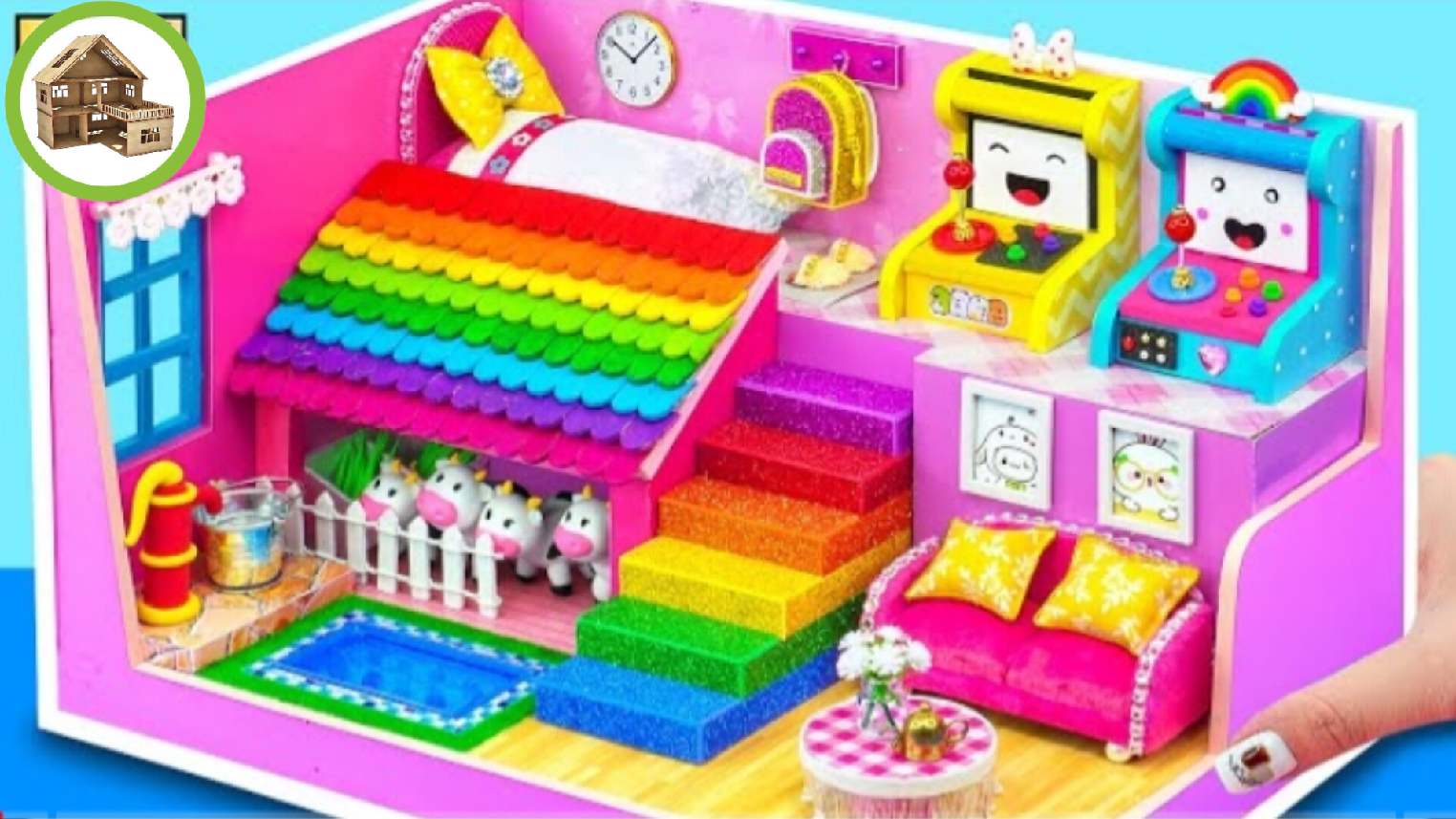 Милый миниатюрный двух этажный домик с коровником и игровыми приставками из картона #82