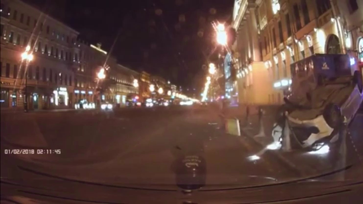 Санкт-Петербург. Авария на Невском проспекте, Хендай Солярис вылетел на тротуар 01.02.2018 Хёндэ Солярис» проехал встречные полосы, вылетел на тротуар, снёс мусорные бачки и опрокинулся на крышу. Судя по всему, обошлось без серьёзных травм: пешеходов на тротуаре не оказалось, людям из машины помогли выбраться очевидцы. Не задело и стоящий у магазина грузовик.