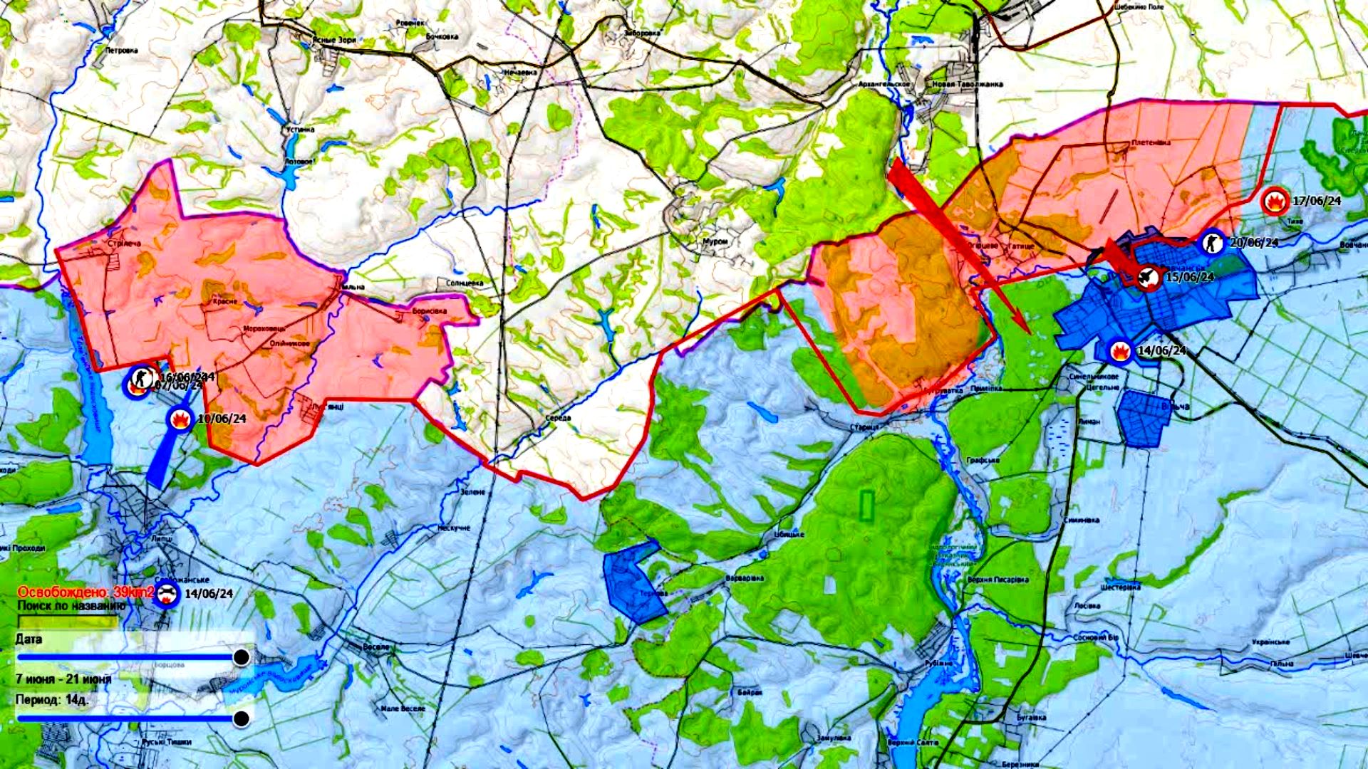 Карта боевых действий в районе города Волчанск и Липцы с 11 мая по 21 июня 2024 года