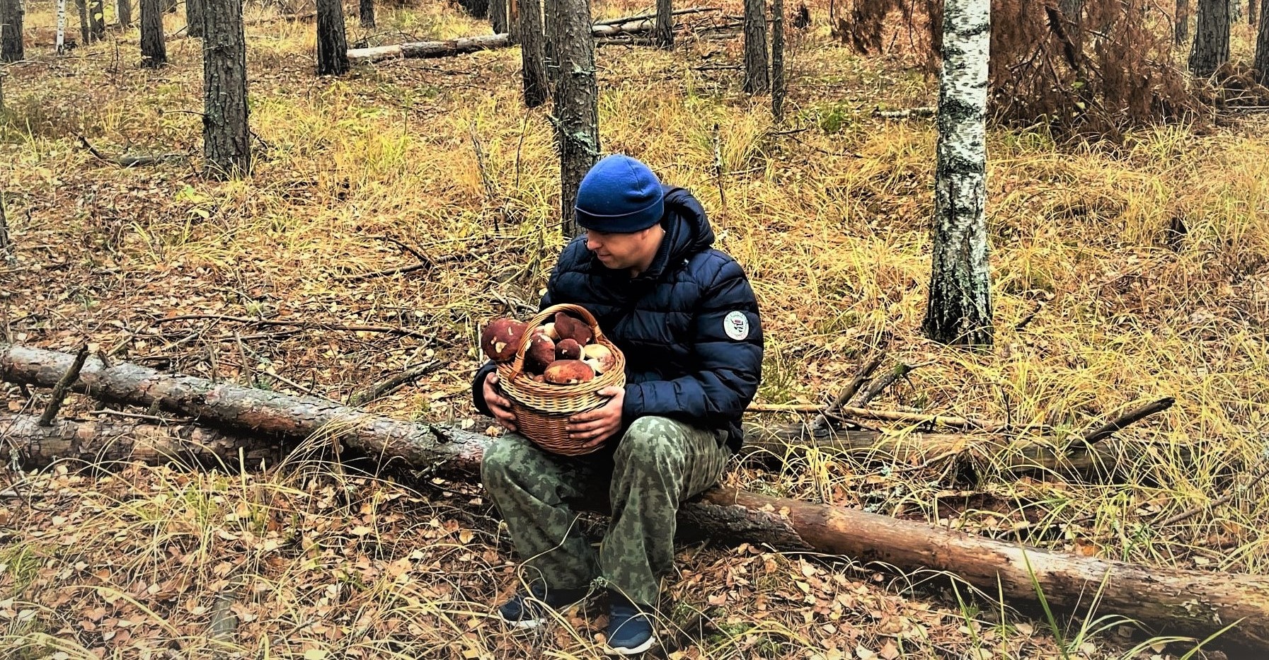 Боровики и белые грибы. Грибник попал под дождь. Грибы в осеннем бору
