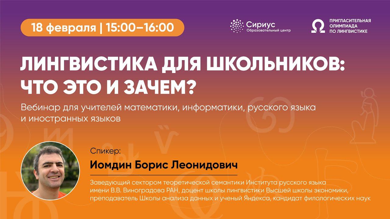 Продолжение вебинара Регистрация на пригласительную олимпиаду по лингвистике доступна по ссылке: https://lingvo.siriusolymp.ru Можно ли понять текст, написанный на языке, который ты никогда в жизни не изучал? Оказывается, что да — и это именно то, что делают школьники на олимпиаде по лингвистике. В преддверии Пригласительной олимпиады по лингвистике, которая пройдёт 10-12 марта, Борис Иомдин расскажет о том, почему лингвистика — не только про языки, но и про логику, а потому близка к математике и информатике. Лингвист покажет примеры реальных олимпиадных заданий, расскажет о том, с чего начать изучение этой науки и как учителю организовать кружок для школьников. За новостями следите в наших социальных сетях про олимпиады: https://vk.com/siriusolymp https://instagram.com/siriusolymp