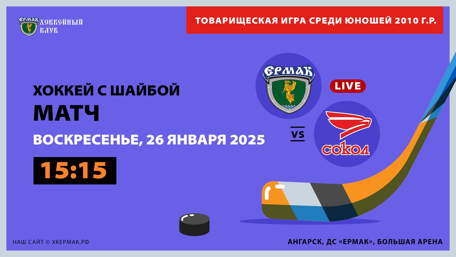 Первенство России по хоккею с шайбой среди юношей 2010 г.р. , дивизион «Сибирь - Дальний Восток». Матч между командами «Ермак» (Ангарск, Иркутская область) и «Сокол» (Красноярск) в Ангарске. 26 января 2025 г., г. Ангарск, большая арена ДС «Ермак»