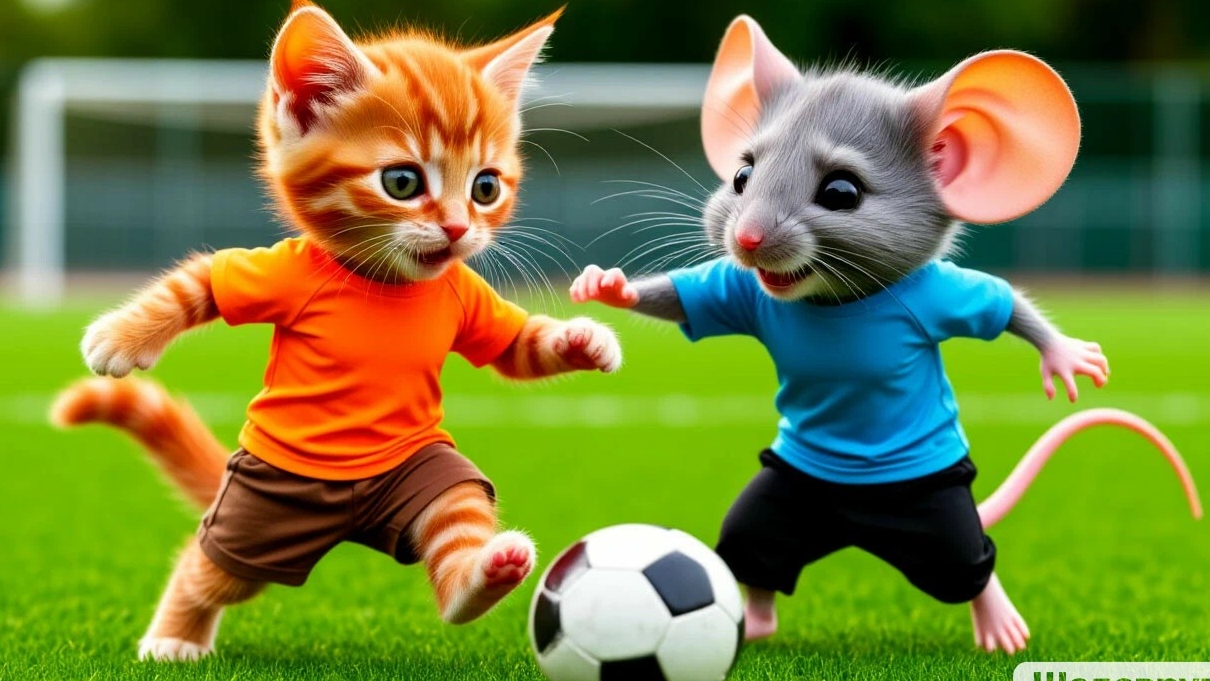 Классное видео о рыжем коте - 322 выпуск: Рыжий котёнок Барсик и серый мышонок Грызлик устроили утром веселую игру в футбол на зелёном лужке. Они бегали, прыгали, использовали разные уловки и финтили, соревнуясь в ловкости и скорости. Игра продолжалась весь день, наполняя их радостью и счастьем. Уставшие, но счастливые, друзья решили непременно повторить это вновь.
