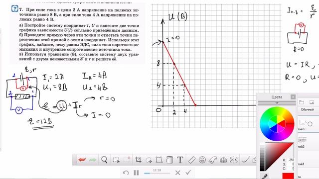 Видео с разбором задачи на применение закона Ома для полной цепи с использованием графика. Сложность - низкая. Аудитория 10 класс.