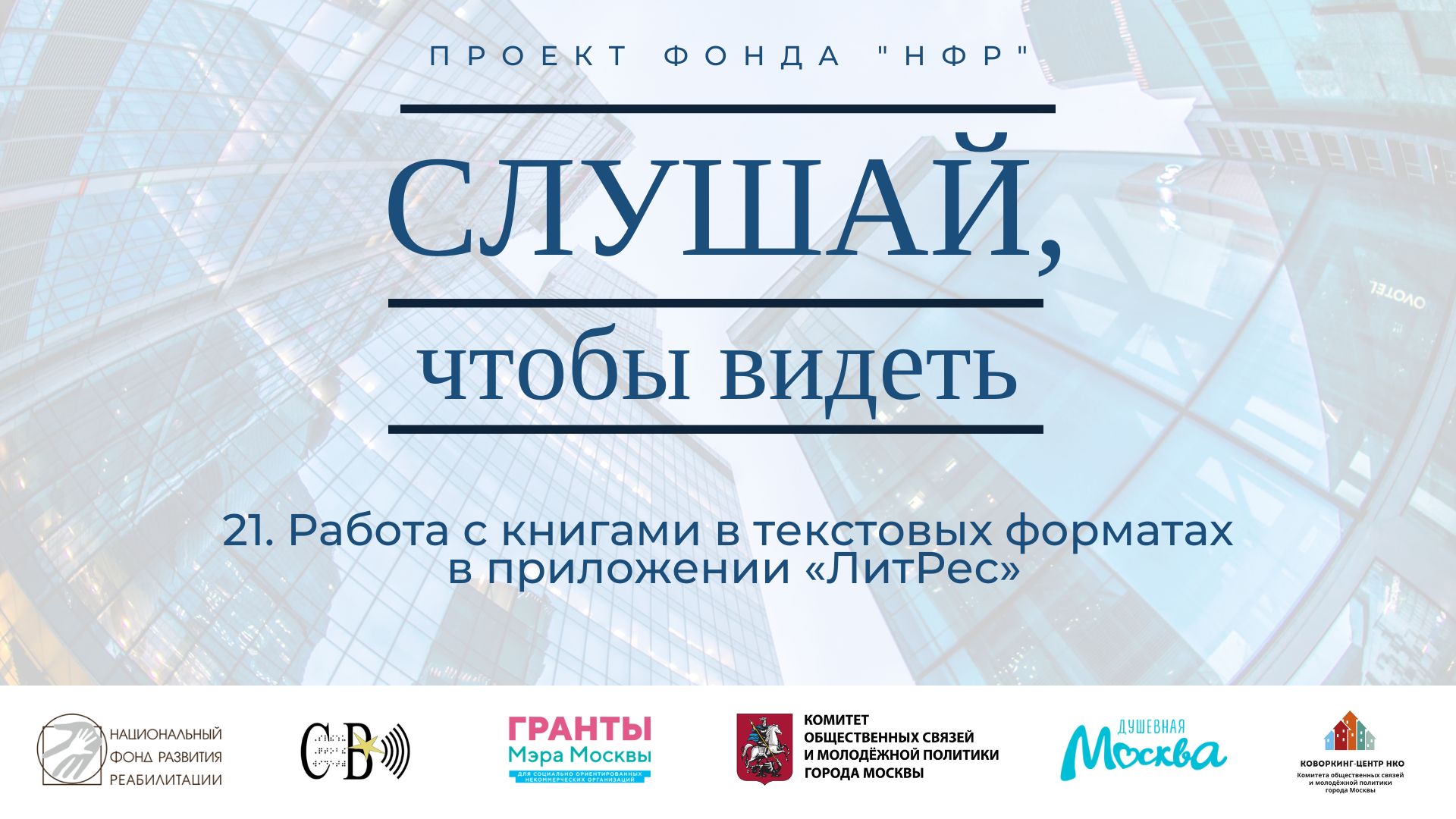 Вашему вниманию предлагается 21-й подкаст проекта «Слушай, чтобы видеть», который создан для незрячих пользователей электронных сервисов. Выпуск посвящен описанию работы с книгами в текстовых форматах в приложении «ЛитРес». Всеволод Попов описывает основной функционал и демонстрирует работу сервиса на примере официального сайта и приложения для пользователей устройств на платформе iOS. Информационно-просветительские подкасты рассчитаны на аудиторию незрячих пользователей электронной техники. Проект реализует «Национальный фонд развития реабилитации», при поддержке Комитета общественных связей и молодежной политики города Москвы. Ссылка на официальный сайт сервиса: https://www.litres.ru/ Ссылка на приложение «ЛитРес» в магазине App Store: https://apps.apple.com/ru/app/%D0%BB%D0%B8%D1%82%D1%80%D0%B5%D1%81-%D0%BA%D0%BD%D0%B8%D0%B3%D0%B8/id438441429