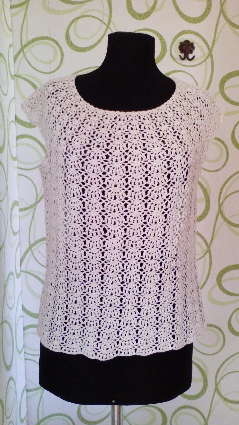 №121 Топик маечка кофточка крючком на круглой кокетке простой узор "веерочки" схема и как вязала.