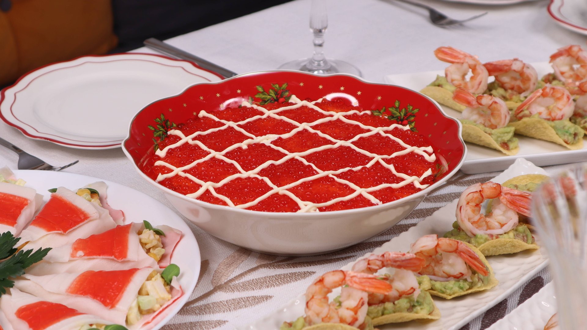 Ингредиенты: Форель слабосолёная: 150г Картофель: 2 средние Креветки варёные: 200г Сырок плавленый: 2шт (180г) Красная икра: 100г Майонез