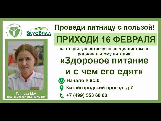 Дорогие друзья! НМИЦ Профилактической медицины приглашает 16 февраля на открытую встречу со специалистом по рациональному питанию по теме «Здоровое питание и с чем его едят» Программа 09:30 – 10:30 «Здоровое питание и с чем его едят» - встреча со специалистом по рациональному питанию • Какие продукты полезны, на что стоит обратить внимание при их выборе, что необходимо включить в ежедневный рацион. • Как правильно питаться во время поста. • Какие продукты недопустимы при сердечно-сосудистых заболеваний. • О чем говорит повышенный холестерин. • Ответы на вопросы. 09:30-12:00 - Бесплатные обследования: измерения веса, роста, расчет индивидуального сердечно-сосудистого риска по системе SCORE. 09:30- 12:00 – вкусный перекус и подарки от нашего партнера «ВкусВилл»!!! Подарки участникам встречи: • 50 % скидка на консультацию диетолога • 50 % скидка на консультацию сомнолога • 50 % скидка на проведение биоимпедансометрии – метод, который позволяет оценить риск развития сердечно-сосудистых заболеваний, определить биологический возраст и индивидуальное значение идеального веса, а также подобрать наиболее оптимальный уровень физической нагрузки, что очень актуально на сегодняшний день. Ждем Вас по адресу: Китайгородский проезд, д.7. Телефон.: 7(495) 510 49 10