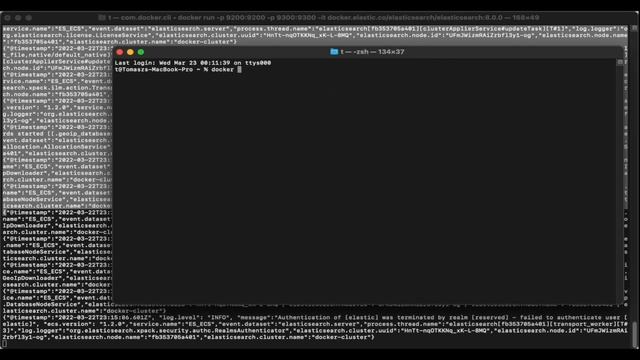 If your docker container log output does not display password for you then you need to do one step to get this password and be able to connect to elasticsearch server. This video cover up - elasticsearch 8.0.0 docker container startup - reseting password for elastic user - connecting to cluster and display status