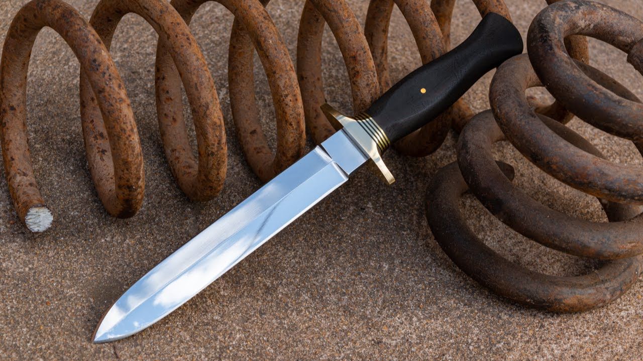 Ковочный нож: добивающий кинжал Я покажу вам, как сделать кинжал из старого резерва своими руками. Я действительно наслаждался этим опытом; Я буду продолжать подделывать, потому что это больше удовлетворяет. Может быть, я не всегда так делаю, но обязательно повторю, чтобы продолжить обучение искусству ковки. Надеюсь, вам понравилось так же, как и мне. Технические характеристики: Совет: острие копья Сталь: 5160 полная длина: 30,6 см Длина клинка: 18,6 см Длина ручки: 12 см Толщина: 6 мм Масса: 226 г Материал рукояти: латунь, пластиковые прокладки и белое дерево квебрахо. ------------------------------------------------------------ Используемые инструменты: Настольные тиски Шлифмашина с отрезным диском Шлифовальный станок Файлы Наждачная бумага с зерном: 180, 220, 340, 400, 600, 1000, 1500 и 2000 г. Эпоксидная смола Дрель с битами Кузнечная печь с двойной горелкой Емкость для темперирования морилка Полировщик ------------------------------------------------------------ Я очень ценю ваш визит и увидимся в следующий раз! #ИзготовлениеНожей #КузнечноеИскусство #РеставрацияМеталла #КовкаНожей #СамодельныеНожи #КованыйКлинок #Металлообработка #ТворческаяКовка #нож #ножи