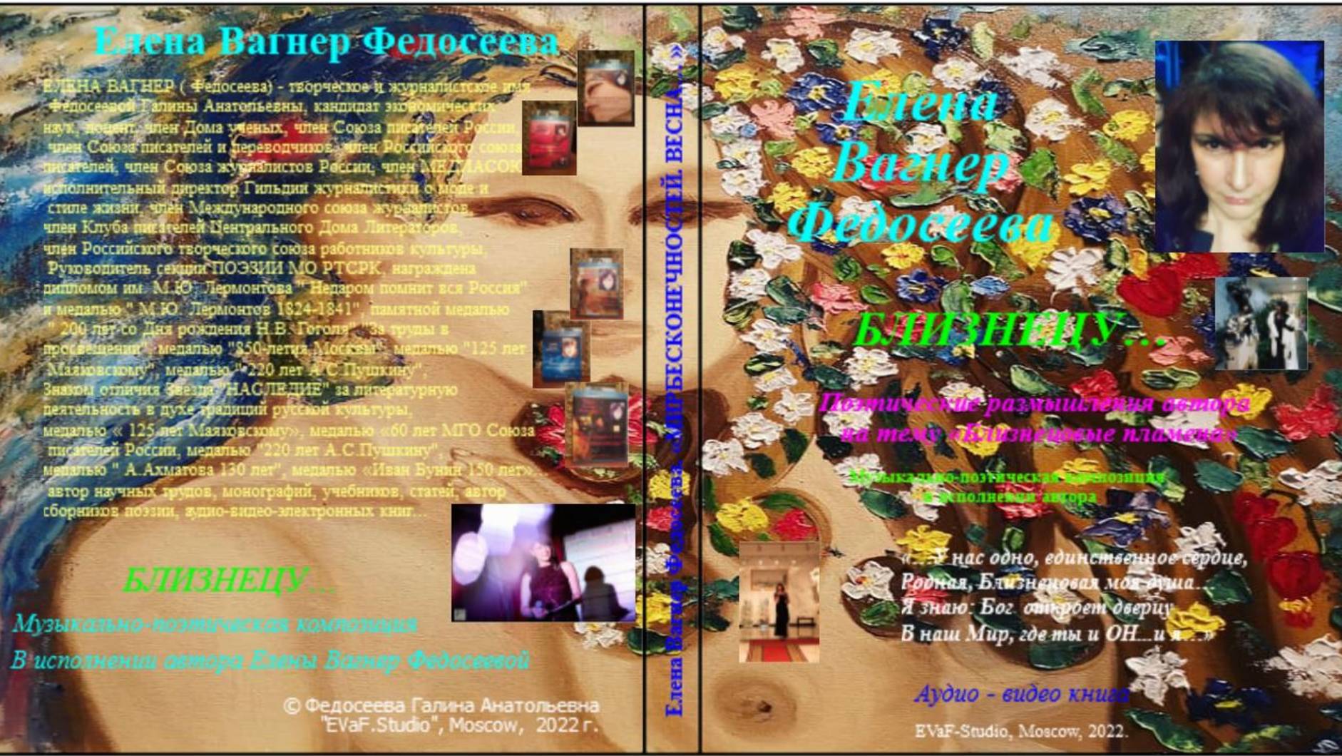Helena Vagner Fedoseeva Вышла моя новая аудио-видео книга, март 2022. Посмотреть и послушать можно на моем канале ютуб ЕВФ, дзен, рутуб, вк. Можно приобрести! Елена Вагнер Федосеева БЛИЗНЕЦУ… Поэтические размышления автора на тему «Близнецовые пламена». «…У нас одно, единственное сердце, Родная, Близнецовая моя душа… Я знаю: Бог откроет дверцу В наш Мир, где ты и ОН...и я…» Музыкально-поэтическая композиция в исполнении автора. Аудио& видео книга. EVaF-Studio, Moscow, 2022. ОТ АВТОРА: Привет! В 2014-2015-м гг. моё видение проблематики совершенных отношений между Близнецовыми Пламенами было именно таким... идеальным... вероятно, я была в Потоке... и всё, что ниже заявленного тогда уровня - просто фикция... так думала я...да, просто нижние плоскости трехмерной Игры в "любовь" я и не рассматривала... всякие "зеркальности" и пр. Вариант... Приятного просмотра! Я не только писала стихи, но и картины... иллюстрации в видео версии - мои картины... холст, масло... размеры 50х60 см ( премущественно)... Картины написаны в период 2015-2021 гг. в т.ч. и " Андрогин" ( март , 2021, Москва). В реакциях слушателей на видео о "Близнецовых пламенах", размещенных на моем ютуб-канале была высказана мысль, что Близнецы на планете одновременно не воплощаются... С позиции 2022 года, скажу, что почти согласна с этим! ЕВФ. пс. Конечно, весь представленный материал нельзя принимать за абсолютную истину... это вариант многомерного мышления...творческого мышления... поэтического мировосприятия... улыбнитесь, друзья! Для инфо: ЕЛЕНА ВАГНЕР ( Федосеева) - творческое и журналистское имя Федосеевой Галины Анатольевны, кандидат экономических наук, доцент, поэт, писатель, художник, независимый журналист, член Дома ученых, член Союза писателей России, член Союза писателей и переводчиков, член Российского союза писателей, член Союза журналистов России, член МЕДИАСОЮЗА, исполнительный директор Гильдии журналистики о моде и стиле жизни, член Международного союза журналистов, член Клуба писателей Центрального Дома Литераторов, член Российского творческого союза работников культуры, Руководитель секции ПОЭЗИИ МО РТСРК, награждена дипломом им. М.Ю. Лермонтова " Недаром помнит вся Россия" и медалью " М.Ю. Лермонтов 1824-1841", , памятной медалью " 200 лет со Дня рождения Н.В. Гоголя" "За труды в просвещении", медалью "850-летия Москвы", медалью "125 лет Маяковскому", медалью " 220 лет А.С.Пушкину", Знаком отличия Звезда "НАСЛЕДИЕ" за литературную деятельность в духе традиций русской культуры, медалью « 125 лет Маяковскому», медалью «60 лет МГО Союза писателей России, медалью "220 лет А.С.Пушкину", медалью " А.Ахматова 130 лет", медалью «Иван Бунин 150 лет», медалью "Сергей Есенин", Знаком отличия Звезда "НАСЛЕДИЕ" 2-ой степени за литературную деятельность в духе традиций русской культуры, медалью "Федор Достоевский 200 лет"... автор научных трудов, монографий, учебников, статей, автор сборников поэзии, аудио-видео-электронных книг, участник выставок живописный работ, автор картин...