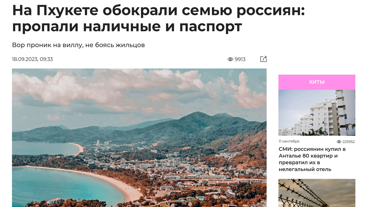 Новости туризма 18/09/2023 На Пхукете обокрали семью россиян: пропали наличные и паспорт #туризм"
