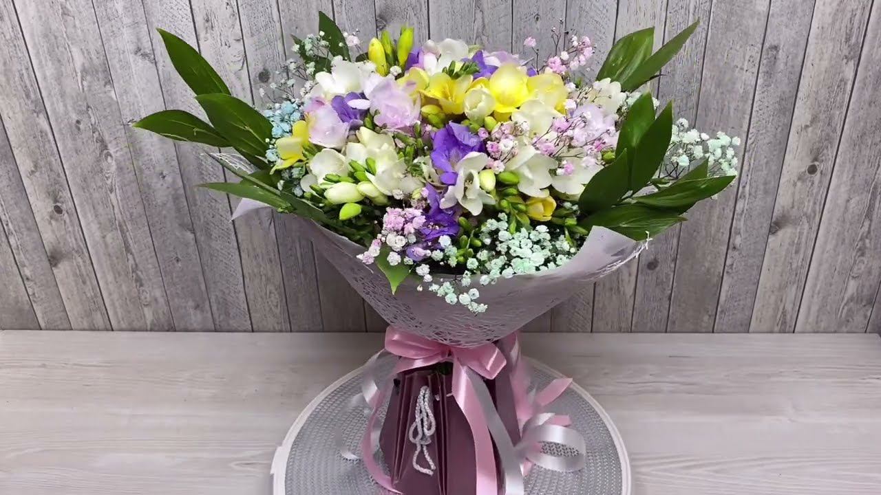 Букет из разноцветных фрезий и гипсофилы. Букеты и композиции из фрезий https://ranunculus.ru/catalog/freziya/ Сайт https://ranunculus.ru
