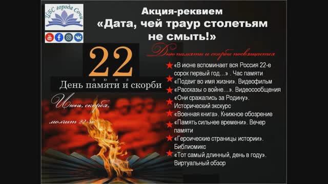 22 июня – Дню памяти и скорби, 80-летию со дня начала Великой Отечественной войны посвящается видеофильм «Подвиг во имя жизни», в рамках акции-реквием «Дата, чей траур столетиям не смыть». Городская библиотека № 1 имени А. С. Пушкина города Сочи. Видео – Валерий Худяков. Все права на использованные материалы сохраняются за правообладателями. 22 июня 2021 года. @biblioteka.pushkina http://library-sochi.ru/ #22июня1941 #Деньпамятиискорби_цбсСочи #Вечныйогонь #СвечаПамяти #Деньпамятиискорби2021_цбсСочи #22июня1941_2021 #деньвкалендаре #датависторииРоссии #АлтарьПобеды_цбсСочи #76летПобеды_цбсСочи #76ВеликойПобеды #цветыПобеды #ПобедаКультура #ВойнаПобедаРодина #СвечаПамяти_цбсСочи #ЖиваяПамятьКубань #СвечаПамяти_Кубань #ДеньПамяти #ИсторияРоссии #Ленточканашейпамяти #литератураПобеды #гордимсяипомним #Безсрокадавности_цбсСочи #БессмертныйПолк_цбсСочи #фотографиигородаСочи #ВославугородаСочи #проСОЧИсь #БиблиотекаПушкинаСочи #библиотекиСочивонлайнформате #культурадляшкольников_цбсСочи #культурадляшкольников2021 #читаемсудовольствием #КультураСочионлайн #читаемсинтересом #времячитать_цбсСочи #читаемдетям #читаемдома #культураРФ #культураСочи #Культура_Кубани #цбсСочи #библиотекиРоссии #детскиебиблиотекиСочи #библиотекиСочи #Библиотеки_Кубани #читатьмодно #чтопочитать #книголюб #времячитать #читаем #стихи #книга #читайипомни #мыслужимкниге #библиотекивонлайнформате_цбсСочи