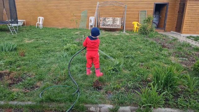 A child waters the grass in the garden with a hose