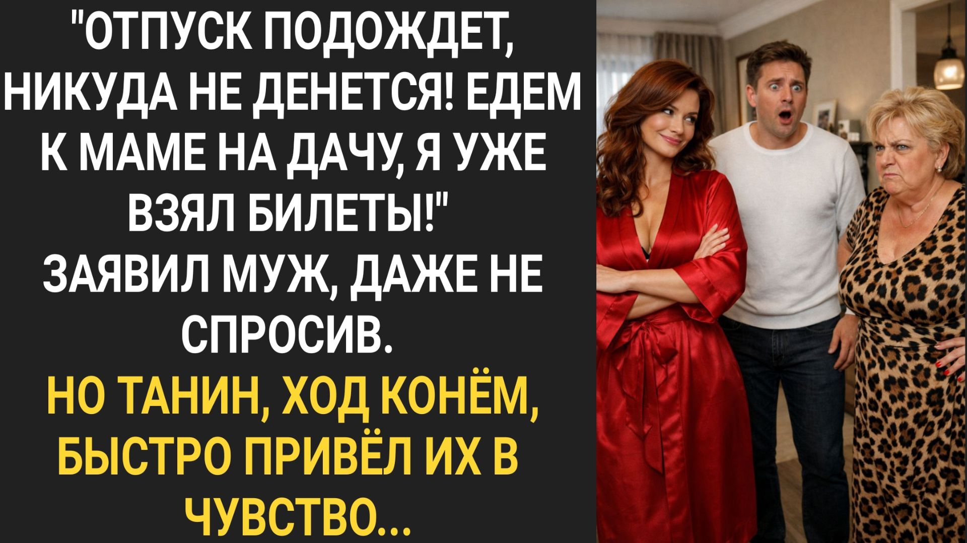 "Отпуск подождет, никуда не денется! Едем к маме на дачу!" Заявил муж, даже не спросив. Но Танин, ход конем, быстро привел их в чувство... Смотрите новую жизненную историю! Подписывайтесь на канал и пишите комментарии, обсудим ситуацию вместе!