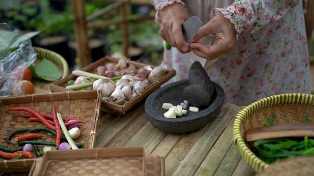 Наслаждайтесь вкусной и простой едой из овощей с рисом Тивул утром Жизнь в деревне Малайзии