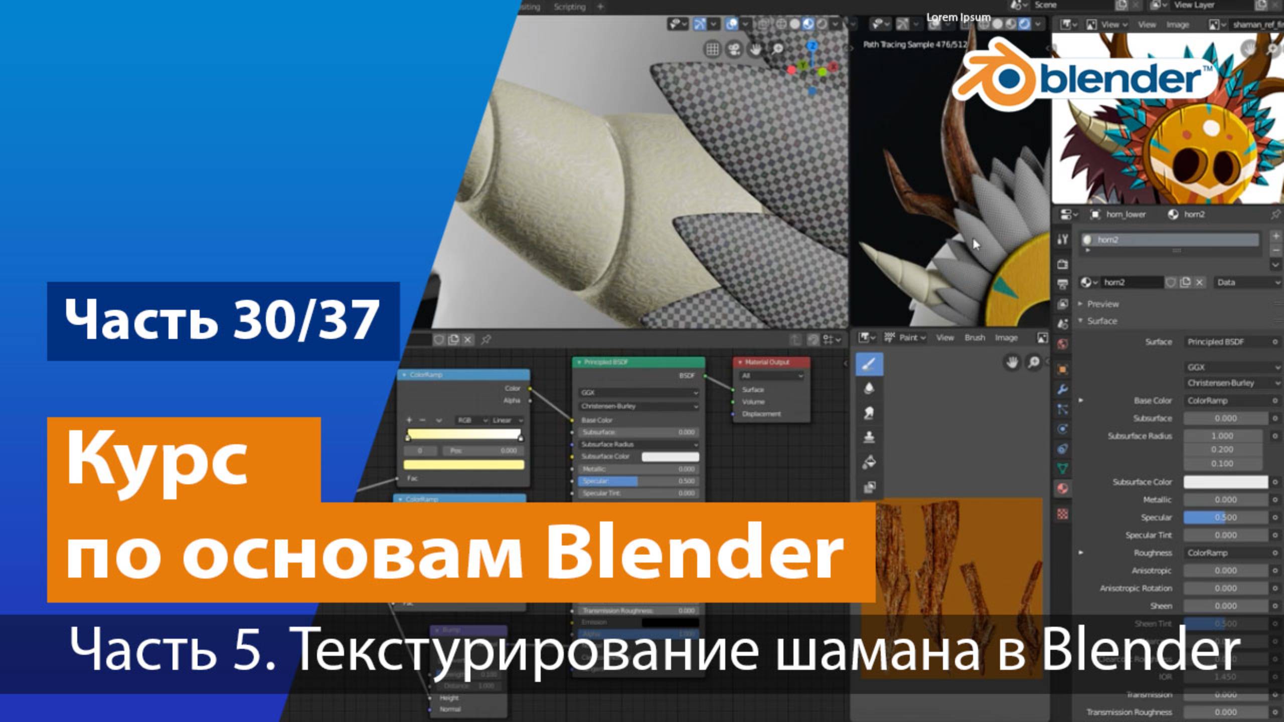 Работа над шаманом продолжается. В уроке вы зададите текстуру рожкам, но не просто коричневую (как на референсе), а под материал «дерево». В заключительной части видео отредактируете результат – добавите шероховатости и неровности с помощью нода Bump.